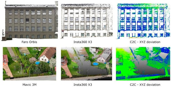 The cloud-to-cloud method was used to evaluate the relative accuracy and cloud deformation obtained from georeferenced spherical images from the Insta360 X3 camera. CloudCompare 2.13.1 [34] software was used for this purpose. The point clouds were aligned (congruent transformation) to several identical points, and the compute cloud/cloud distance function was run. Depending on the test, either full 3D (XYZ) distances or horizontal (XY) deviations were computed. The visualized errors correspond to the selected type and are shown in 2D views for clarity. The spatial standard deviation of the first point cloud compared to the Faro Orbis point cloud is 47 mm. In the second case, compared to the Mavic 3E point cloud, the spatial standard deviation reaches 82 mm. The resulting standard deviations are presented in Table 5.