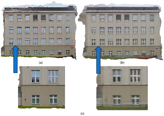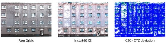 To verify the proposed improvements, an experiment was conducted where selected methods were tested. In this experiment, a combination of the suggestions from the previous section was carried out. First, a series of images was taken at ca. 10 m from the façade; the camera height was 2 m above the surface in the first pass and 4 m in the second pass. Following this, without GNSS equipment, images were taken at two equal height levels (2 and 4 m) at 3 m from the facade. A comparison of this experiment with the point cloud from Faro Orbis is shown in Figure 13.