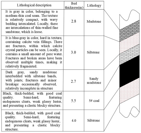 The Dayuan Coal Industry is currently mining the 5# coal seam, with a thickness of 5.5 m and a dip angle ranging from 38° to 44° (average 42°). The 1502 level roadway, driven along the floor, is located at a depth of approximately 300 m. The immediate roof of the 5# coal is sandy mudstone with a thickness of 2.7 m, and the immediate floor is siltstone with a thickness of 4.0 m. The characteristics of the roof and floor rock layers of the 5# coal seam are shown in Figure 1.