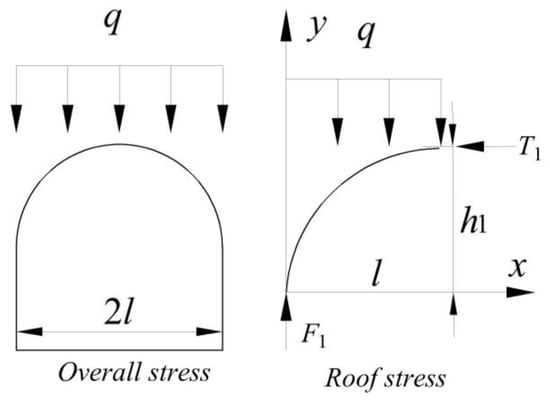 where F1 is the vertical force acting on the straight wall above the arch cross-sectional roadway, T1 is the horizontal force acting on the midpoint of the roof, l is half the roadway width (the three roadway cross-sections share the same width and equal cross-sectional area to minimize size discrepancies), and h1 is the arch height of the roadway (m).