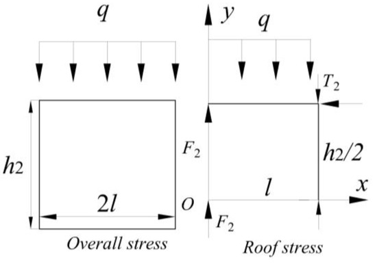 where F2 is the vertical force acting on the shoulder corner of the rectangular cross-sectional roadway, T2 is the horizontal force acting on the roof, and h2 is the roadway height (m).
