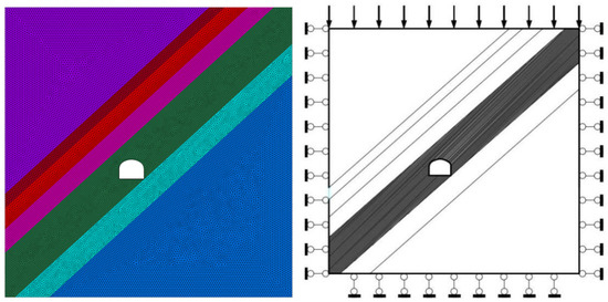 The roof boundary of the three-center arch cross-sectional roadway is composed of three tangent arcs. The self-weight load of the overlying rock is simplified as a uniform vertical stress q applied to the top of arch cross-sectional roadway, where q = γH (unit: MPa) γ is the unit weight of the overlying rock (unit: kN·m−3) and H is the burial depth of the roadway, taken as 330 m. The stress distribution on the arch cross-sectional roadway is shown in Figure 3.
