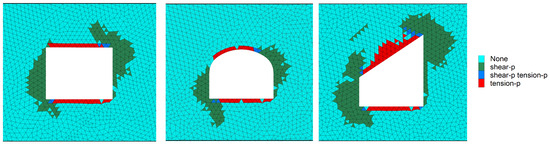 As shown in Figure 7, the plastic zones of the surrounding rock of the three cross-sectional shape roadways exhibit pronounced asymmetry. At the same time, affected by the differences in cross-sectional shapes and roadway bearing characteristics, large-area shear failures occur at the lower part of the lower side and the roof on the upper side, and the plastic zone range and depth reach the maximum at different positions of the sidewalls. The inclined-roof trapezoidal section exhibits the largest plastic zone area. Although the inclined roof conforms to the coal seam dip angle to reduce the shear effect between coal bedding planes, due to stress concentration, large-area plastic deformation and failure occur at the shoulder corners, with a maximum failure depth of 2.1 m, and more serious tensile failure occurs in the side roof under the condition of a larger roof length. The rectangular section ranks second in the plastic zone area. Under the combined action of shear slip between coal bedding planes and stress concentration, serious shear failures occur near the lower part of the lower side of the roadway and the shoulder corner of the upper side, with maximum failure depths of 1.5 m and 1.8 m, respectively. The arched section displays the smallest plastic zone area. Shear failures are mainly concentrated in the lower part of the lower side and the arching position of the upper side roof, with a maximum failure depth of 1.2 m.