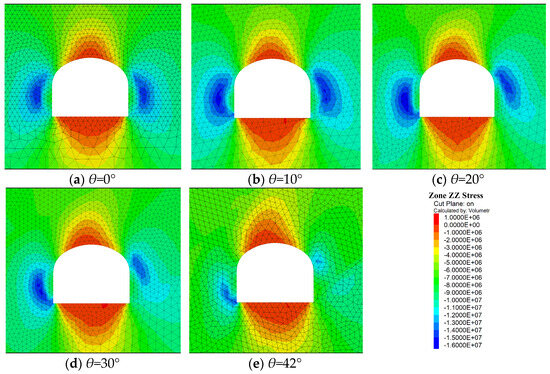 Vertical stress state of arched roadway under different coal seam inclination angles.