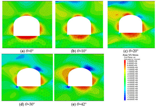 As shown in Figure 8, the vertical stress concentration area gradually shifts along the direction of the coal seam dip angle, and the deflection direction is almost consistent with the inclined direction of the coal seam. When the coal seam dip angle θ ≤ 20°, the maximum vertical stress value is about 16 MPa, close to the vertical stress peak of near-horizontal coal seam roadways. As θ ≥ 20°, not only does the vertical stress concentration area deflect, but the vertical stress on the two sides of the roadway also begins to decrease. When θ = 42°, the maximum vertical stress on the lower side of the roadway is 15.08 MPa, and on the upper side is 12.96 MPa, which are 6% and 19% lower, respectively, compared with the dip angle of 20°. The ratios of the difference between the horizontal stress peak and the stress at the symmetric position to the peak under coal seam dip angles of 0°, 10°, 20°, 30°, and 42° are 0.013, 0.057, 0.098, 0.244, and 0.417 in sequence.