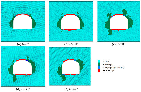 As shown in Figure 10, the plastic zone of the roadway surrounding the rock exhibits pronounced asymmetry, with the development of the plastic zone dominated by shear failure. The plastic zone of shear failure gradually deflects along the direction of the coal seam dip angle, and the deflection direction is almost consistent with the deflection direction of the stress concentration area. At a coal seam dip angle of 42°, extensive shear failures occur at the lower portion of the inferior sidewall and the arch crown of the inferior side roof, with a maximum failure depth of 1.2 m.