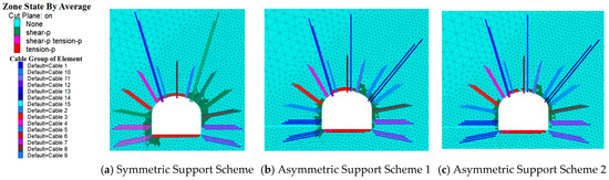 The roadway section of the 1502 transportation roadway is a three-centered arch section with a width of 4.2 m, a height of 3.3 m, and a springing height of 1.8 m. Based on the existing symmetric support scheme for 1501 and the study on the asymmetric stress distribution and deformation failure law of surrounding rock in large-dip thick coal seam roadways, asymmetric support parameters were proposed. The deformation of the surrounding rock under different support schemes was simulated, and the plastic zone area was statistically analyzed. The parameters of each support scheme are summarized in Table 3, and the plastic zones of surrounding rock under different support schemes are shown in Figure 11.