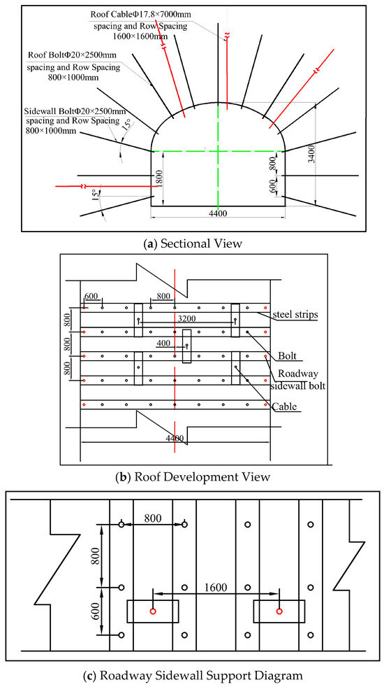 By comparing the plastic zone areas of different support schemes with corrected data, the plastic zone area of Asymmetric Support Scheme 2 is the smallest (89 grid cells), significantly reduced by 32.6% compared to the Symmetric Support Scheme (246 grid cells) and by 15.2% compared to Asymmetric Support Scheme 1 (105 grid cells). This demonstrates that Asymmetric Support Scheme 2 exhibits the strongest ability to suppress plastic deformation development in the surrounding rock, optimize the stress distribution, and enhance roadway stability. Therefore, based on the superior control effect on plastic zone expansion and engineering safety requirements, Asymmetric Support Scheme 2 is confirmed as the final support scheme for the 1502 transportation roadway.Therefore, considering the control effect on the plastic zone and engineering safety, Asymmetric Support Scheme 2 is selected as the final support scheme for the 1502 transportation roadway.The support diagram of the final asymmetric support scheme is shown in Figure 12.