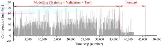 The time series of the configuration data is collected by means of field observations. The data provide information about the configuration of the product. Since this information specifies the configuration of failure, one can more quickly conclude which line has more failures. In order not to disturb the nature of the data and to see the performance of the models on the raw data, no pre-processing is applied to the raw data. The data and their portions are given in Figure 2. The sampling range is [0, 100]. The series has 45,654 data. It has units of number.