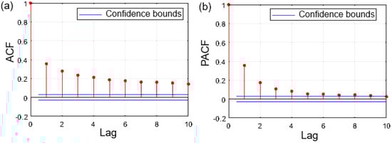 As seen in Figure 3, in the ACF graph, the zero-lag peak is, as expected, equal to 1. Subsequently, a strong positive correlation is observed at the first lag, and the correlations at the following lags gradually diminish toward zero. This indicates that the autocorrelation of the time series decays slowly, suggesting a potentially non-stationary structure. Given the distinctiveness of this decline, the data can be classified as autoregressive (AR) in nature. In the PACF graph, a high correlation is observed for the first lag, and from the third lag onward, correlations rapidly approach zero. Consequently, it has been determined that the series is an AR-type time series with three lags.