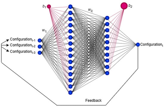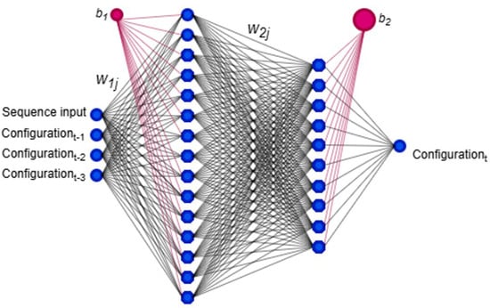 Having too few neurons per layer may lead to inadequate representation, while having too many may result in overfitting. Various formulas exist to determine the optimum neuron number in each layer. One such formula is where and are the neuron numbers in the input and output layers, respectively; is the data count in the training set; and α is an arbitrary scaling factor, typically ranging from 2 to 10. stands for the neuron number in the hidden layer. In this study, the total number of data points is 45,654, with 80% used for training, so, , , , and . Therefore, the neuron number must satisfy . Nevertheless, a higher number of neurons can be used provided that overfitting is avoided. The term Configuration(t) is the output, while {Configurationt−1, Configurationt−2, Configurationt−3} are inputs, indicating that the output feeds back into the input. In the form of a function, it can be expressed as Configurationt = f(Configurationt−1, Configurationt−2, Configurationt−3, w, b) where represents the weights of each connection. means bias. It can improve a model’s prediction efficiency. It adds a constant value leading to systematic behaviour [].