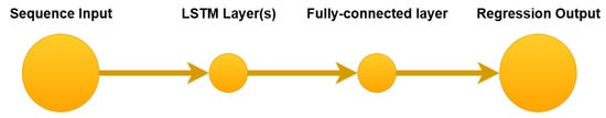 LSTM is a model with an RNN structure. This network consists of layers. The main layers are an input layer, LSTM layer(s), and an output layer. The input layer processes the data received from external sources. The LSTM layers hold hidden units, the core components responsible for the model’s learning capability. These units calculate data sequentially and learn temporal dependencies. The output layer transforms the information processed by LSTM into a final output format (e.g., classification, regression, or sequence prediction). The recurrent structure of LSTM specifically provides the ability to learn long-term dependencies in time-series data. The general architecture of an LSTM network is shown in Figure 5.
