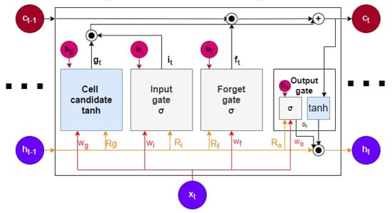 A hidden unit includes three gates, the input gate, forget gate, and output gate. The gates determine which information the model retains and which it discards. Each gate employs sigmoid activation functions that are regulated by weights and biases. This is shown in Figure 6, where , and , respectively, represent the input gate, forget gate, cell candidate, and output gate. denotes the hidden state. , , and represent the input weights, recurrent weights, and biases, respectively. t denotes the time step, is the set of input variables, is the set of outputs (hidden states), and denotes the cell state.