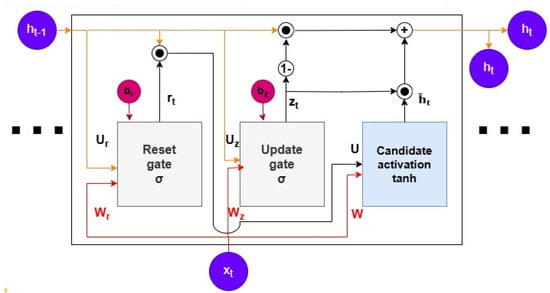 Initially, at t = 0, the output vector is . At time t, the activation of GRU, denoted as , is a linear interpolation between the previous activation and the candidate activation as given in Equation (10).