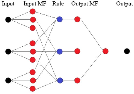 ANFIS has a hybrid architecture that combines fuzzy logic with artificial neural networks, leveraging the strengths of both approaches. It comprises five fundamental layers that process input data to produce a crisp output, with each layer performing a distinct function. In the fuzzification layer, input variables are transformed into fuzzy sets, and each input is assigned appropriate fuzzy values through predefined membership functions (MFs). This transformation allows the system to effectively handle uncertainty. In the multiplication layer, the antecedent parts of the fuzzy rules are combined, and the firing strength of each rule is computed. When the “AND” operator is used, the outputs of the membership functions are multiplied to determine the weight of the corresponding rule. The normalisation layer normalises each rule’s weight by dividing it by the total weight, thereby calculating the relative importance of each rule. The defuzzification layer converts the fuzzy outputs into crisp values using specific mathematical techniques, most commonly the weighted average method. Finally, the aggregation layer combines the outputs of all rules to generate the final system output. This multilayer structure enables ANFIS to successfully model complex nonlinear systems by integrating ANN’s learning capability with fuzzy logic’s interpretability, making it a powerful tool for prediction and modelling. Figure 9 illustrates the topology of the ANFIS network used. The architecture and parameters of each layer are presented in Table 4.