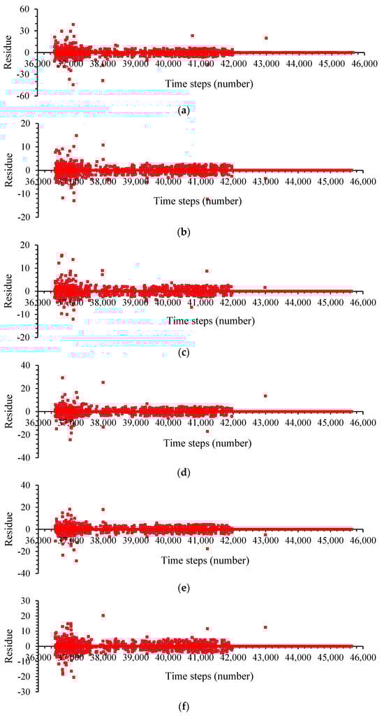 Through regression analysis, the correlation coefficient, denoted by R, is calculated. For regression analysis, a first-order regression is applied to fit a curve. The correlation in this curve is computed using the formula . In regression plots, the “fit line” represents the first-order regression applied to the entire set of (target, output) points. This line takes the form of output = a × target + c, where a is the slope of the linear regression line. c is the intercept on the “output” axis. The correlation between this line and the data is shown by R in the plot. While R is the correlation coefficient, R2 is the coefficient of determination. Both are dimensionless. While R is good at evaluating the strength and direction of a linear relationship between two variables, R2 is good at evaluating the proportion of variance. The R2 value can be [0, 1]. It means that the model explains 100 × R2% of the variance in the dependent variable. When it comes to the R value, [0.01, 0.29], [0.30, 0.70], or [0.71, 0.99] indicate a weak, moderate, or strong relationship, respectively. A value of 0 implies no relationship, while negative values indicate an inverse linear relationship. The absolute increase in R signifies a stronger relationship. The “target” axis includes original data, while the “output” axis includes data predicted by the network. Ideally, these values should be equal, in which case R = 1 and all points lie on the 45° line. Although regression analysis shows the linear relationship, it is not solely sufficient to evaluate a model’s performance []. Therefore, these findings must be supported by other statistical control methods and error metrics to ensure more reliable results.