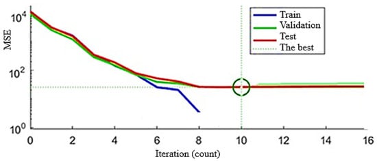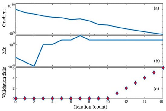 Since the Levenberg–Marquardt algorithm is based on gradient descent, the decrease in gradient and increase in mu in Figure 16 are expected outcomes. The increase in validation error beyond the 10th iteration (green curve in Figure 15) and failure of further validation are more clearly visible in Figure 16c. During optimisation, the gradient should decrease as the model approaches the target, and it should reach zero at the exact minimum or maximum point. From this perspective, the gradient reduction shown in Figure 16a is a sign that the training algorithm is approaching an optimal value. Another indicator is the mu value; its increase suggests proximity to optimality. In Figure 16b, the mu curve consistently rises, further indicating successful training. The final indicator is the validation status shown in Figure 16c. At the end of each iteration, the model’s accuracy is assessed. Validation is expected to succeed. As shown, validation is successfully performed for the first 10 iterations, but fails consecutively in the following 6, indicating increasing error. This confirms that the best training outcome is achieved within 10 iterations, and continuing beyond that results in overfitting. If validation fails six times in a row, the model reverts to the state at the sixth successful validation to ensure the best model is retained.