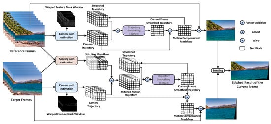 During stitching trajectory generation, the reference frame’s motion trajectory has already been computed via the camera trajectory estimation module and serves as a global baseline. The motion of the target frame, however, is determined by combining its temporal continuity with the local motion information obtained from the stitch meshflow in the spatial domain. Defining and as the local motion vectors obtained from temporal sequence analysis and spatial matching, respectively, the overall motion of the target frame in the reference frame coordinate system can be expressed as