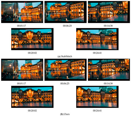 In the comparison images, it is evident that in the overlapping region between the reference and target frames, the stitched image generated using StabStitch contains noticeable artifacts, which are highlighted by red boxes. The generation of these artifacts can mainly be attributed to the large compensation required in the target frame for a smooth transition during fast camera movements, while the reference frame fails to synchronize with effective compensation. This results in a clear misalignment in the overlapping area. In contrast, our method applies motion compensation between both the target and reference frames and uses L1 photometric loss in the overlapping region to align the image content. This not only ensures video stability but also significantly improves the alignment accuracy of the overlapping region, resulting in a more natural and coherent visual effect.