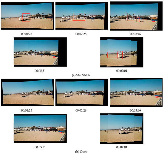 With the widespread adoption of smartphones, sensor resolutions have steadily improved. However, due to the limitations of built-in consumer-grade lenses, the field of view (FoV) of cameras remains restricted [1]. Video stitching technology combines multiple video sequences from moving cameras into a single frame with a wider FoV and higher resolution, thereby enhancing the user’s immersive visual experience. This technology has been widely applied in video surveillance [2], drone inspections [3], and autonomous driving [4]. However, low-quality or failed video stitching not only compromises the visual experience but also reduces the accuracy of downstream video analysis tasks such as object detection and tracking [5,6,7].