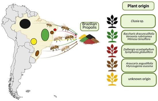 Geographical locations of Brazilian propolis production and the floral origin; created with BioRender.com.