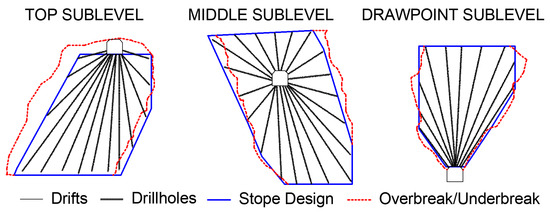 Excavation design in underground mining must predict and control rock displacements within and around excavations to prevent fractures of intact rock, excessive roof and floor deflections, and rock sliding along weakness planes, all of which significantly impact mine stability. Consequently, the stability of underground excavations is closely linked to the stability of their walls, where stope and room characteristics significantly influence overall mine stability. The design of these excavations must anticipate rock mass behavior and consider slope stability, a fundamental aspect of underground mining projects due to their complexity and interdependencies. Additionally, the design must predict dilution, defined as waste rock mixing with ore, thereby reducing its grade. Planned dilution consists of unavoidable waste rock within the stope, whereas unplanned dilution refers to waste rock outside the stope boundaries due to blasting or poor rock stability. Unplanned dilution significantly increases operational costs in underground mining [1,2,3,4]. Figure 1 illustrates various sublevel stoping methods, including drift layouts, drillhole configurations, and differences between designed and actual stope shapes due to overbreak (dilution) and underbreak (ore loss).