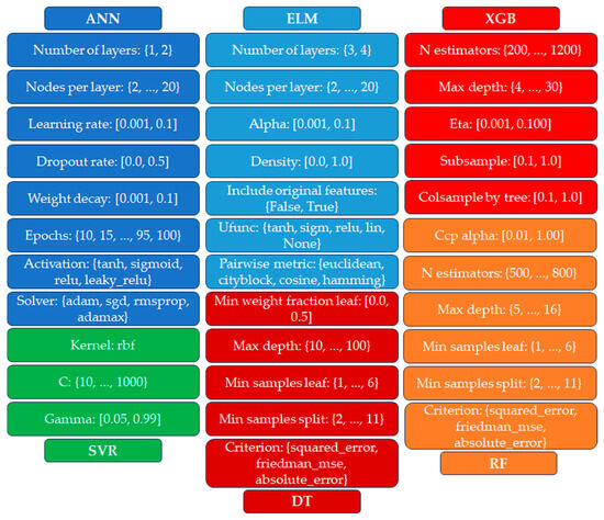 The predictive performance of machine learning (ML) models is highly sensitive to the configuration of their hyperparameters, making hyperparameter tuning a critical and often complex stage in model development. This process involves navigating a high-dimensional and frequently non-convex search space, which renders it computationally intensive and potentially prone to suboptimal convergence. While approaches such as greedy search and population-based metaheuristic algorithms are commonly adopted, they can exhibit limitations in regards to convergence speed and efficiency. Not all hyperparameters contribute equally to a model’s performance; hence, the selection of which parameters to tune must be made judiciously. For instance, in artificial neural networks, hyperparameters such as learning rate, number of hidden layers, and number of neurons per layer are known to directly affect both convergence rate and predictive accuracy. Similarly, in tree-based models like decision trees and random forests, key hyperparameters—including maximum tree depth, minimum number of samples per leaf, and the number of trees—govern model complexity and generalization capacity [79,80]. Figure 2 illustrates the hyperparameters of these models subjected to tuning procedures, where square brackets [ ] indicate real number ranges and curly brackets { } indicate categorical or integer domains.