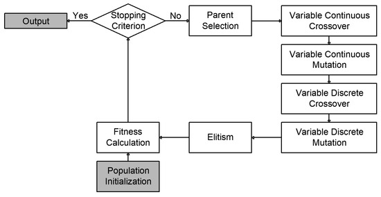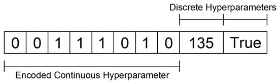 Figure 3 illustrates an example of a chromosome representing one encoded continuous hyperparameter and two discrete hyperparameters, while Figure 4 presents a flowchart of the GA process used to optimize model hyperparameters.