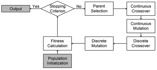 In a GA, each chromosome represents a potential solution where variables are arranged sequentially. Continuous variables are typically encoded in binary form, requiring decoding to compute the fitness function, while discrete variables assume predefined values without encoding. Due to these characteristics, continuous and discrete hyperparameters must undergo different mutation and crossover operations.