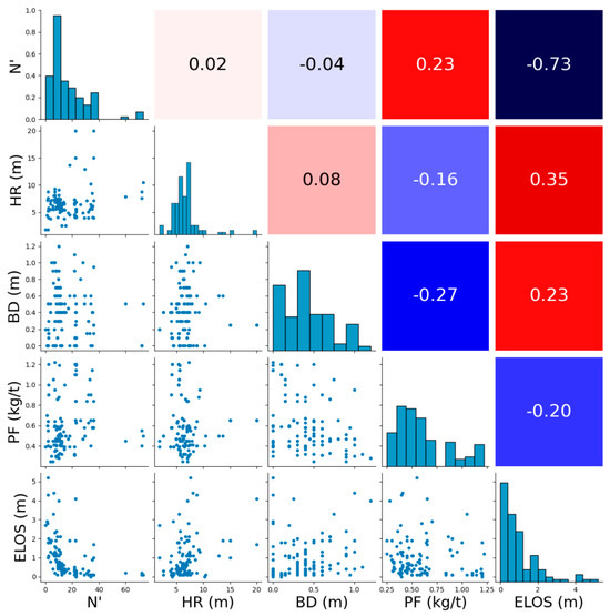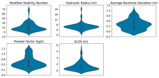 The dataset used in this study was obtained from Zhao and Niu [51], consisting of 120 samples with five independent variables: modified stability number (N′), hydraulic radius (HR (m)), mean borehole deviation (BD (m)), powder factor (PF (kg/t)), and equivalent linear overbreak slough ( (m)). These parameters are relevant because they address aspects related to the rock mass classification, stope geometry, drilling, and blasting—fundamental factors for assessing stope stability and predicting dilution, as stated by Wang [4]. As previously mentioned, simulation-based and empirical methods often overlook or oversimplify some of these variable classes. Therefore, the dataset employed in this study offers a comprehensive and suitable foundation for the application of supervised machine learning techniques, allowing for more accurate and data-driven predictions. In the supervised learning context, serves as the dependent variable (target y), while the remaining features comprise the independent variable set X.