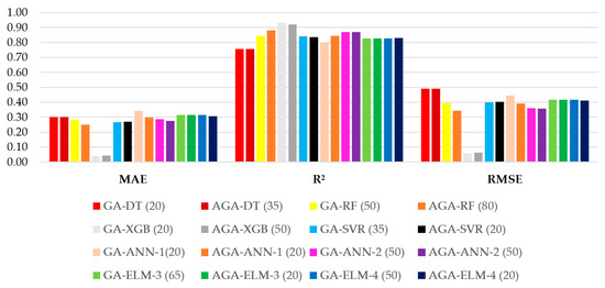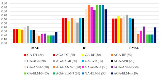 Given that the proposed methodology generates 10 distinct hyperparameter sets for each machine learning model—five derived from different population sizes in GA and five from different population sizes in AGA—it was necessary to define a selection criterion to determine the best overall configuration. For each genetic algorithm (GA and AGA), the optimal hyperparameter set was determined based on the following ranking criteria: