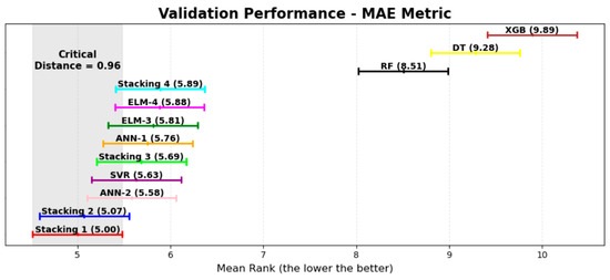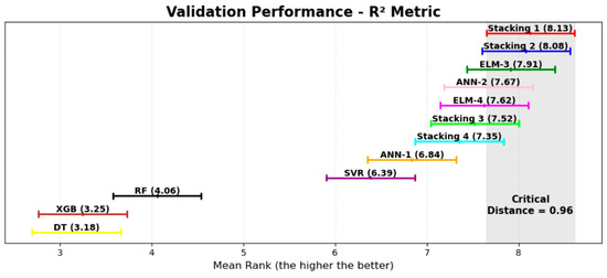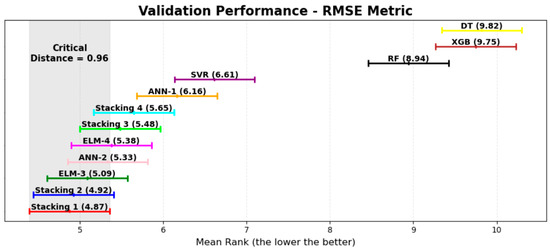 To account for the stochastic nature of the proposed pipeline, nonparametric statistical tests were employed to determine whether a model’s performance is statistically superior to that of other models, based on the validation dataset metrics. The Friedman test [82] is a widely used nonparametric statistical test designed to detect differences in performance across multiple trials when the same subjects (datasets) are exposed to different treatments or conditions, such as predictions from various ML-based models. This test ranks the performance of each model per dataset and then compares the average ranks across models to assess whether statistically significant differences exist. In the case of tied ranks, average ranks are assigned.
