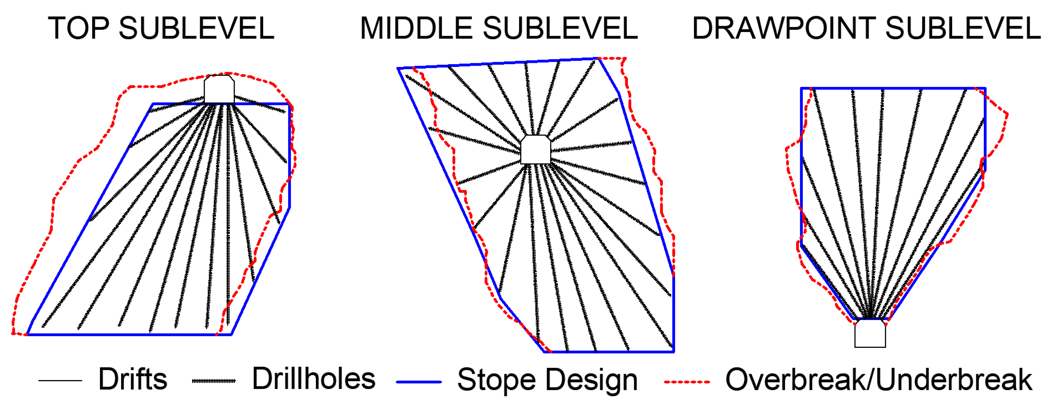 Different sublevel stoping methods, including drift layouts, drillhole configurations, and variations between designed and actual stope shapes due to overbreak (dilution) and underbreak (ore loss).