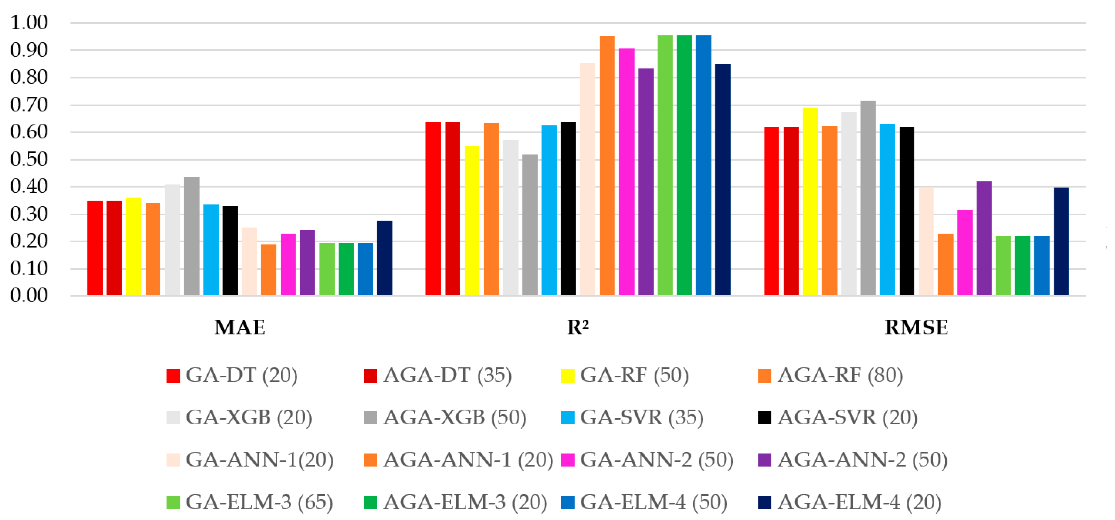 The computed training and testing metrics for each model—optimized through GA and AGA—are presented in Appendix B. All validation metrics reported in this study represent the mean values across different folds, accompanied by their corresponding standard deviations, ensuring a statistically robust evaluation of model performance.