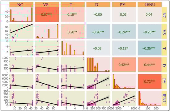 The correlation analysis was conducted using all available data. Due to the non-normal distribution and the presence of a significant number of ties, Kendall’s Tau-b was employed as it better accounts for tied ranks and has less influence on it. Among the predictors, D exhibited significant positive correlations with both PY and IENU, with r-values of 0.42 and 0.44, respectively (p < 0.01) (Figure 1). In contrast, VS and T showed negative correlations (r ≈ −0.24, p < 0.01), while NC was not significantly associated with the targets. The low intercorrelation among predictors suggests their independence, supporting their inclusion in predictive models.