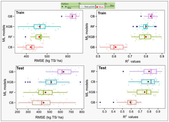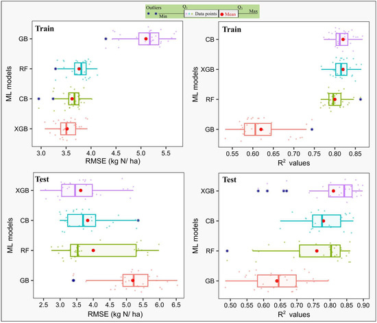 To enhance the rigor of our analysis of Data 2, four ML models were trained using 80% of the data and the remaining 20% for testing. However, due to the random nature of the split, each 80/20 split varied, leading to inconsistent model performance outcomes. To ensure robustness and reduce variance, 30 separate runs of the train/test splits were conducted, and the results were reported as the mean of these runs. This methodology aligns with the approach used by [65], who applied a similar strategy in their study using RF to predict soybean yield; however, they also included multiple repetitions to optimize hyperparameters. Each run involved training and tuning the ML models using 10-fold cross-validation and normalization transformations (Table S1). The RF and CB models demonstrated superior generalization capabilities, maintaining both high R2 values (0.79–0.83) and low RMSE across training and testing sets (Figure 2). These models handle noise and nonlinear interactions well due to their ensemble structures and averaging mechanisms, making them robust against overfitting and suitable for relatively small and heterogeneous datasets.