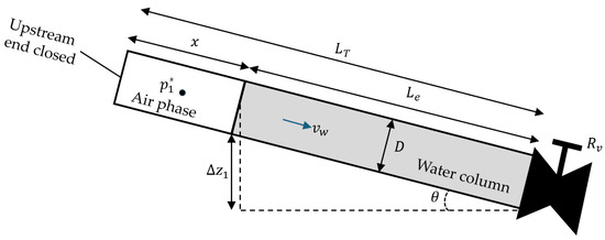 - Water column behaviour [5,11]: The water column can be modelled using the rigid water column approach.where is the water velocity, is the air pocket absolute pressure, is the atmospheric pressure, is the water density, is the water column length, g is the gravity acceleration, is the pipe slope, f is the Darcy–Weisbach friction factor, D is the internal pipe diameter, A is the cross-sectional area, is the resistance coefficient of a regulating valve, and is the water flow. Minor losses () through a regulating valve are estimated using the formula .It should be noted that the closed air pocket prevents the complete drainage of the water, thus avoiding from reaching zero. In other words, as the water drains, the pressure in the air pocket decreases until it matches the external atmospheric pressure, without the contents being fully emptied. Subsequently, the water column begins to refill, causing the pressure inside the air pocket to rise above the atmospheric pressure, and the draining process resumes. This cycle describes a continuous oscillatory dynamic.