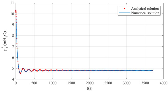 The analytical solution is now checked by first numerically solving the original system (4)–(6) and comparing its solution with the analytical solution (20)–(22) and (32)–(34) on the respective time intervals. During the test, the following parameters were considered: m, , m, s2/m−6, m, , Pa, rad.
