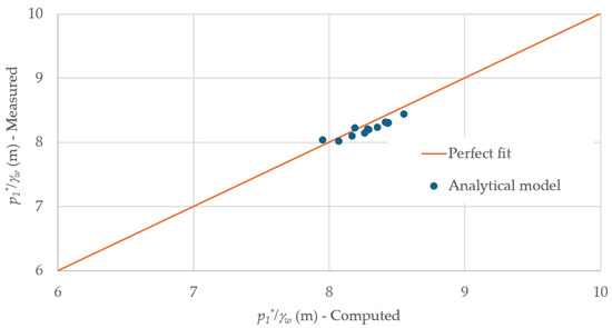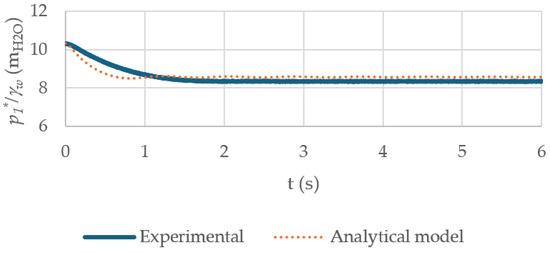 Furthermore, the analytical model was validated using experimental measurements conducted by the authors, as reported in Reference [5], where a single pipeline with an internal diameter of 42 mm and a total length of 4.36 m was employed. In this case, conditions similar to those of the practical application were considered, implying that the upstream end remained closed during the simulations. For the analysis, the initial air pocket size, , ranged from 0.205 to 0.450 m; longitudinal pipe slopes varied between 0.457 and 0.515 rad; and resistance coefficients at the regulating valves ranged from 11.89 to 138.41 × 106 ms2/m6. The analytical solution was applied under the assumption of instantaneous valve opening to provide conservative (safety) estimates, while the experiments were conducted considering a gradual valve opening. Figure 7 presents a comparison between the computed and measured evolution of the air pocket pressure over time, for an initial air pocket volume of 0.450 m, a longitudinal slope of 0.457 rad, and a resistance coefficient of 30.86 × 106 ms2/m6. The discrepancy observed during the initial seconds is attributed to the experimental setup, in which the regulating valve was gradually opened using an opening manoeuvre time of 0.3 s.