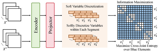 Within the proposed multi-view consistency-based self-supervised representation learning framework, the module for consistency fusion and loss function design serves as the critical component that connects the previous two modules and enables unified objective optimization. Its primary function is to integrate multi-view embeddings and apply information-theoretic loss functions for joint training, thereby enhancing the semantic density and structural alignment of the representation space. As shown in the architectural diagram, this module consists of three sub-processes: encoding–projection, variable soft discretization, and information entropy maximization. Inspired by contrastive learning and variational inference, the design emphasizes mining cross-view mutual information while preserving local consistency constraints within individual views, as shown in Figure 3.