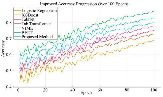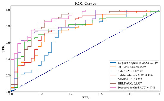 To comprehensively evaluate the performance of the proposed method, comparisons were conducted with several classical and state-of-the-art baseline models, including logistic regression [53], XGBoost [54], TabNet [55], TabTransformer [56], VIME [57], and BERT [58]. Logistic regression is a well-established linear model suitable for linearly separable data. It is widely used due to its simplicity and computational efficiency. XGBoost, a gradient-boosted decision tree algorithm, is capable of capturing nonlinear feature interactions and exhibits strong resistance to overfitting, making it a popular choice for structured data modeling. TabNet is a deep learning-based model that combines attention mechanisms with decision tree-inspired feature selection. It enables automatic identification of informative features and is particularly effective in modeling sparse structured data. TabTransformer leverages the transformer architecture to model tabular data and is capable of capturing long-range dependencies among features, making it well suited for datasets with complex feature interactions. VIME is an SSL framework specifically designed for structured data. It effectively learns latent representations by maximizing the similarity of representations under various perturbations, and performs well in scenarios with limited labels and high missing rates. Although originally designed for natural language processing, BERT has recently been adapted for structured data tasks due to its powerful contextual representation learning capabilities, which are advantageous in feature representation and downstream prediction tasks.