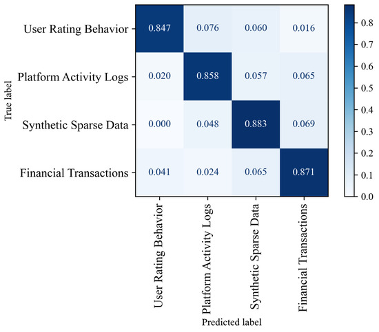 To validate the generalization capability and robustness of the proposed method, extensive experiments were conducted on four types of structured datasets, including user rating behavior, platform activity logs, synthetic sparse data, and financial transactions. As shown in Table 4 and Figure 6, the proposed method consistently achieved high accuracy (above 0.85), F1-score, and AUC across all datasets while maintaining a low normalized mean squared error. These results demonstrate the model’s effectiveness in handling heterogeneous data structures and its applicability across multiple domains.