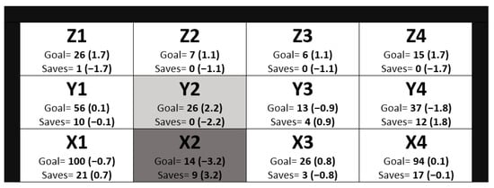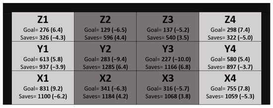 Overall distribution of goals and saves across goal zones. Adjusted residuals (AR) are shown in parentheses and were classified as excitatory trends (AR > 1.96) or inhibitory trends (AR < −1.96). Dark-gray boxes indicate an inhibitory trend for goals and an excitatory trend for saves, while light-gray boxes indicate the opposite. The codes X, Y, and Z indicate goal height from bottom to top; the codes 1 to 4 indicate horizontal position from left to right.