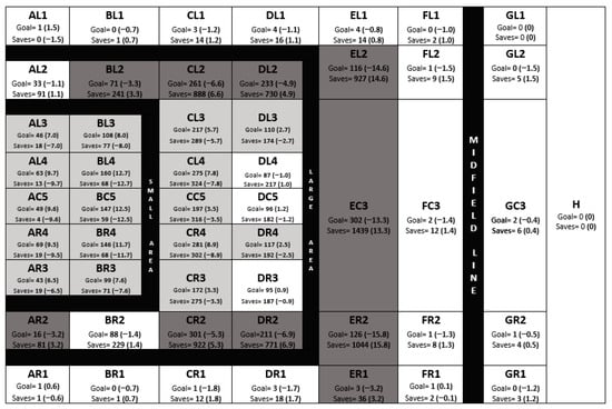 Figure 2 illustrates the goals and saves across field zones, highlighting a clear relationship between shot location and action success (χ2 < 0.001). Excitatory patterns for goals were observed for shots into the six-yard box and its extension into the penalty area (except for boxes DL4, DC5, and DR3). In contrast, excitatory patterns for saves were identified in the lateral zones of the penalty area (except for boxes AL2 and BR2) as well as in at the front of the penalty area. The remaining field zones did not show significant trends.