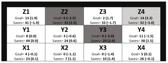 Distribution of goals and saves across goal zones in penalty shots. Adjusted residuals (AR) are shown in parentheses and were classified as excitatory trends (AR > 1.96) or inhibitory trends (AR < −1.96). Dark-gray boxes indicate an inhibitory trend for goals and an excitatory trend for saves, while light-gray boxes indicate the opposite. White boxes indicate no significant trends. The codes X, Y, and Z indicate goal height from bottom to top; the codes 1 to 4 indicate horizontal position from left to right.