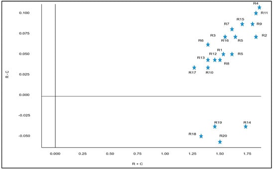 In the second part of the study, the risks obtained in the first part using the Fuzzy Delphi method were analysed using the Fuzzy DEMATEL method. The Cause Score, Result Score, and Total Interaction Scores were determined using the Fuzzy DEMATEL method. The risks were ranked from the highest to the lowest scores obtained. In the next stage of this study, the sum of the rows (R) and the sum of the columns (C) were calculated using Equations (A17) and (A18) to produce an effective FTA diagram. The R − C and R + C values were calculated using Equations (A19) and (A20) with the R and C values.