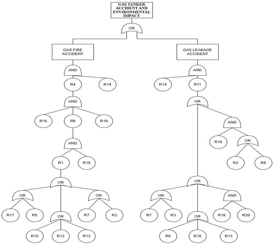 Expert opinion has led to the development of an FTA diagram that is suitable for use worldwide. In the FTA diagram, gas fire and gas leak accidents were identified as the main factors. In the Fuzzy DEMATEL method, the risks obtained using Equations (A17) and (A18) and calculated using Equations (A19) and (A20) are divided into cause-and-effect groups. Causal risks are linked with an ‘OR’ gate, while effect risks are linked with an ‘AND’ gate. The FTA diagram is shown in