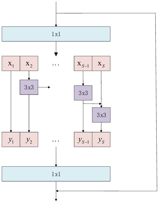 After the network has extracted the basic features of an image, the network should further fuse and enhance these features. In the module of YOLOv5, the C3 module is also an important part, which fuses feature information of different levels through multiple convolution and residual connection. However, to align with the improvements made to the backbone network and enhance the detection accuracy for small and medium-sized targets, this paper did not adopt a C3 module. Instead, it utilized C3Res2Net, which replaces the Bottleneck in the C3 module of the YOLOv5 neck network with a Res2Net [36] structure. Res2Net is an improved residual network structure, which is characterized by the introduction of more scale variations in each residual block. Traditional residual blocks typically contain only one path, but Res2Net enriches the feature representation by adding multiple branches. These branches have different convolution kernel sizes or channel numbers, allowing richer contextual information to be captured. In this way, Res2Net was able to significantly improve the model’s performance while keeping the parameter count low. In this paper, we replace the Bottleneck in the C3 module of the YOLOv5 network with a Res2Net structure. Specifically, we replace each Bottleneck unit in the C3 module with a Res2Net block with multiple branches. These branches extract features through different convolution operations and fuse them through residual connection. In this way, we can take advantage of Res2Net’s scaling characteristics to enhance the feature extraction capability of the C3 module. The replacement C3 module maintains the original input–output interface, so it can be seamlessly integrated into YOLOv5’s network. The structure of Res2Net is shown in Figure 4. By constructing hierarchical residual connections within a single residual block, this structure improves the multi-scale feature representation capability of the network at a finer level. Res2Net divides channels into S groups convolution operation. The larger the value of S, the stronger the receptive field’s ability to learn multi-scale features.