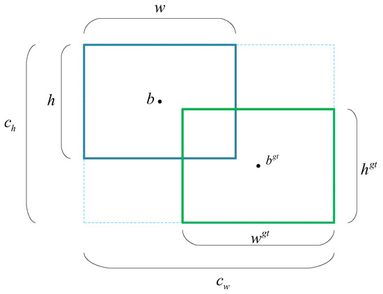 Although CIOU has increased the aspect ratio, the definition of the aspect ratio is vague. EIOU [38] proposes to disentangle the influence of aspect ratio by independently calculating the length and width of the predicted bounding box and the ground truth. The description of EIOU is shown in Figure 6. The EIOU loss consists of three components: overlap loss, central distance loss, and width–height loss. The first two components follow the methodology established in CIOU, while the width–height loss specifically minimizes the discrepancy between the dimensions of the predicted and ground truth boxes, thereby accelerating the convergence speed of the model training process. EIOU explicitly incorporates the differences in width and height into the loss calculation, enabling the model to more accurately locate and fit small and medium-sized targets, thereby improving detection accuracy. In contrast, although CIOU also considers the aspect ratio, its handling may not be as direct in optimizing width and height as EIOU, leading to slightly inferior performance on small and medium-sized targets. Although the design of the EIOU loss function increases the complexity of training, potentially resulting in longer training times, this does not affect the model’s inference efficiency. During the inference stage, the model has already completed its learning and no longer needs to calculate the loss function. Therefore, the improvements introduced by EIOU do not increase the latency in practical applications. This means that EIOU enhances detection performance while maintaining good real-time performance, making it particularly suitable for scenarios with high requirements for both accuracy and speed. The definition of EIOU is shown in the equation: