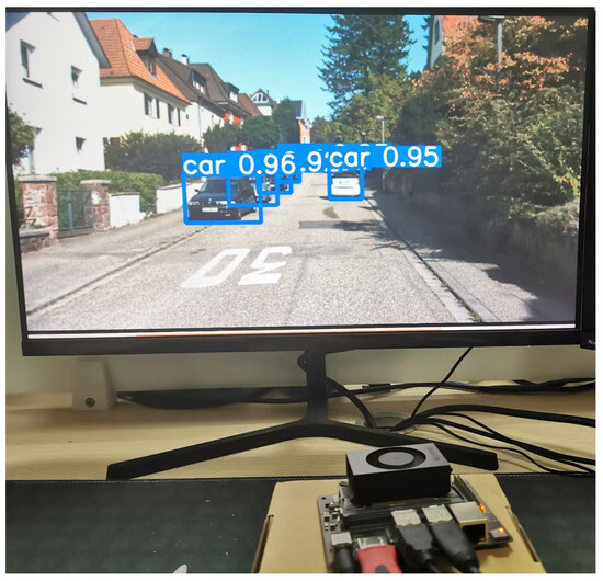 In this paper, YOLOv5s-6.0 is used as the baseline for network training using Adam optimizer. The batch size is set to 32, and the number of epochs is 150. OneCycle learning rate scheduling strategy, 0.001 initial learning rate, 0.01 learning rate factor and 0.0005 weight decay factor are adopted. The momentum of the first three pre-training stages is 0.8, and then it becomes 0.937. In addition, the input image size is uniformly . The experiment was designed on a PC platform with a Xeon (R) W-2223 CPU@3.60 GHz, an NVIDIA GeForce RTX3080 GPU, running on the Ubuntu 18.04 operating system and developed using the PyTorch 1.13 framework. The edge platform is Jetson Xavier NX, as shown in Figure 7, featuring a six-core NVIDIA Carmel Arm® v8.2 64-bit CPU, 384 Core NVIDIA Volta™ architecture GPU with 48 Tensor Core, and it runs on Ubuntu 18.04. All models were trained on a same PC. Similarly, when deployed on the Jetson Xavier NX, all models were quantized by using the TensorRT method.